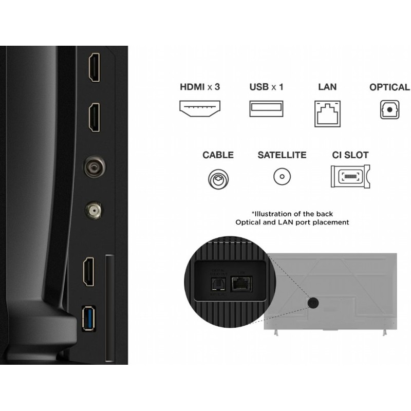 Voor audio beschikt de televisie over ingebouwde luidsprekers die ondersteuning bieden voor Dolby Audio, waardoor stemmen helder klinken en geluidseffecten meer ruimtelijkheid krijgen. Het slanke en moderne ontwerp maakt dat de televisie mooi in elk interieur past, terwijl de VESA wandmontageoptie flexibiliteit biedt in plaatsing.